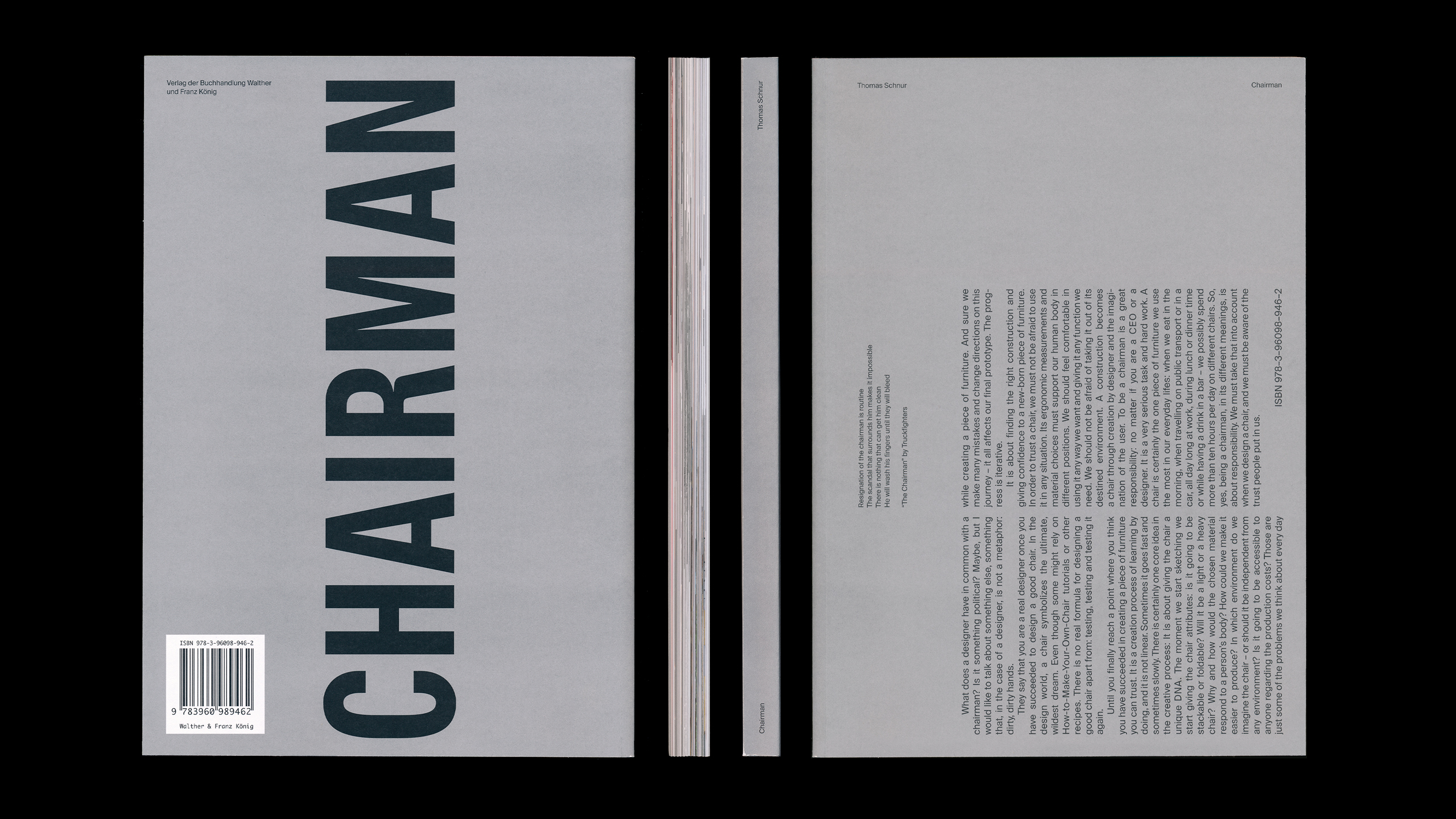 Chairman is a book on German designer Thomas Schnur, published by Verlag der Buchhandlung Walther und Franz König. As a self-proclaimed “chairman” in both senses of the word, Schnur designs chairs and furniture that address ecological, economic, and social challenges. Across 172 pages and 329 illustrations, it traces his design process through sketches, photos, and drawings. The layout is deliberately constructed, images precisely aligned to an axis. The cover carries the introductory text, a quiet contrast to the image-rich inside.