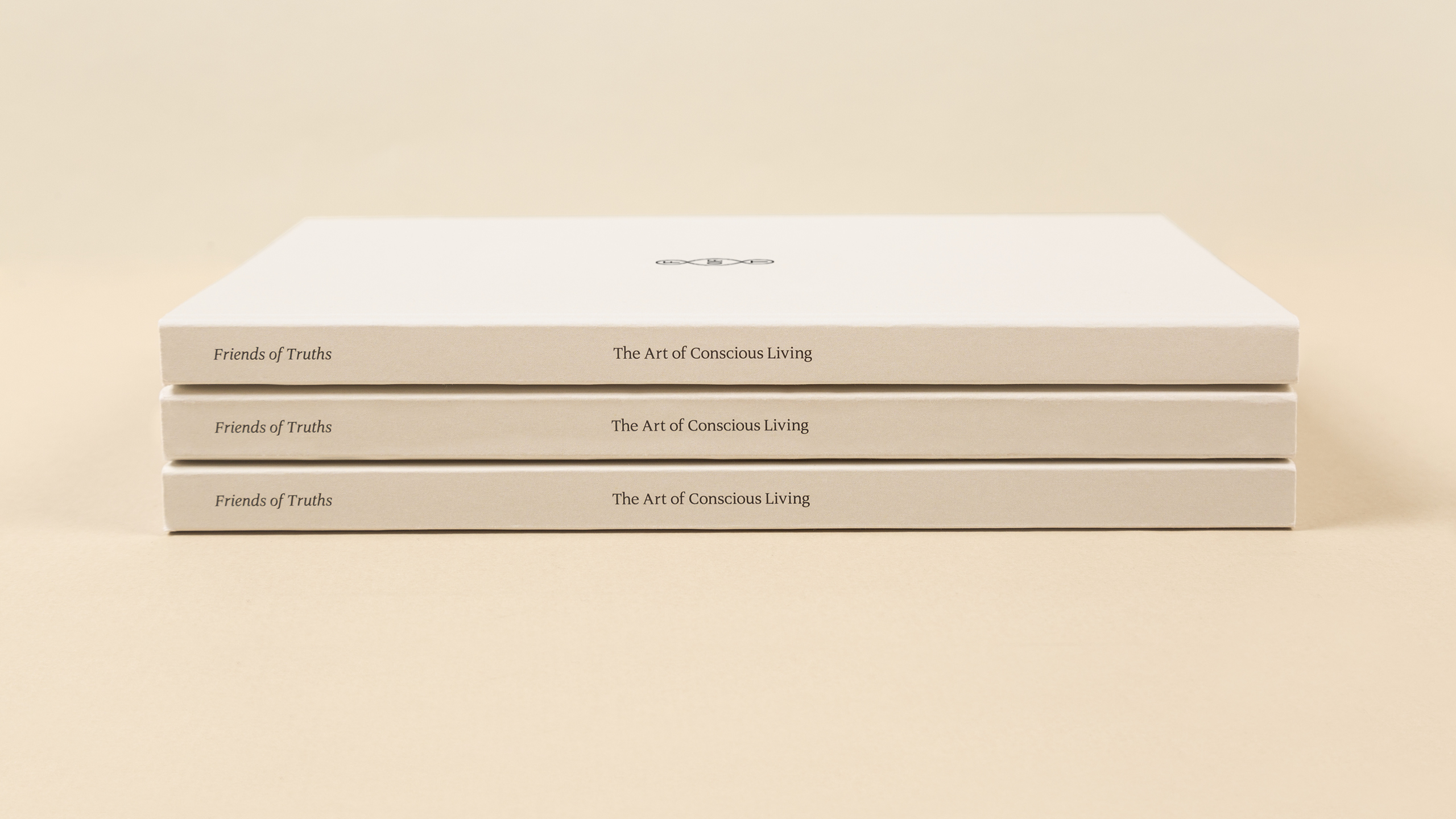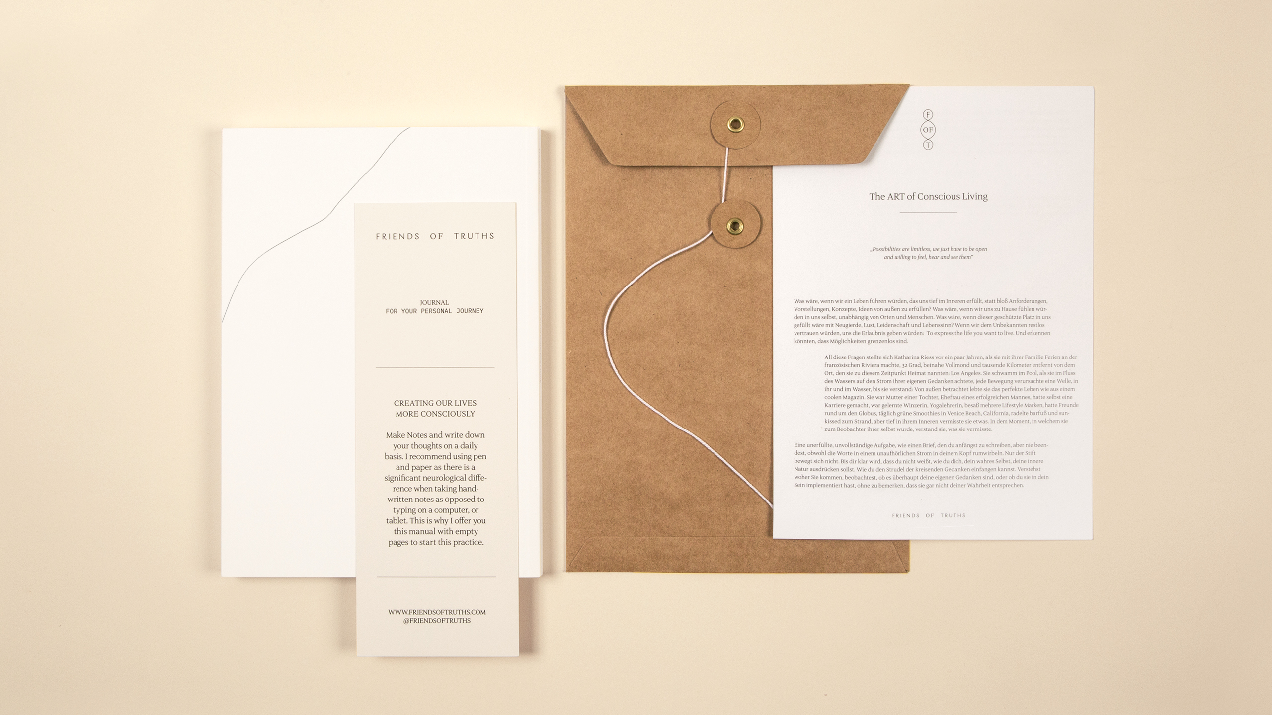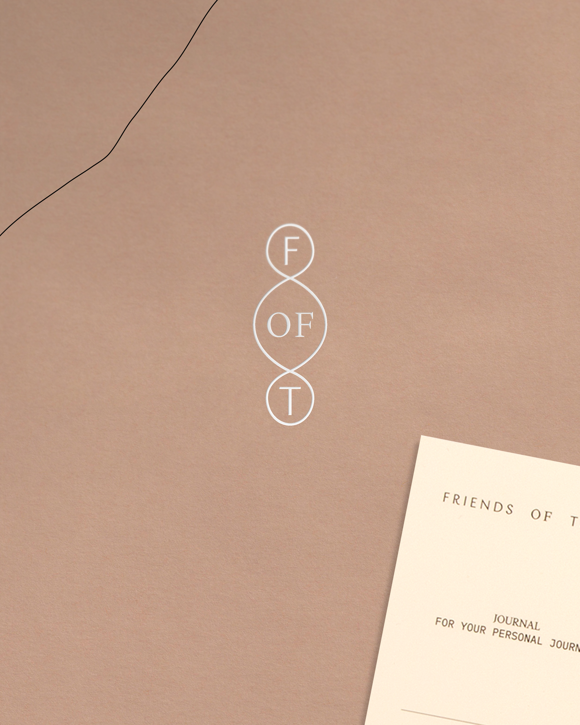 Friends of Truths is a spiritual lifestyle brand dedicated to conscious living. The identity revolves around connection: people to people, body to mind, human to nature. A hand-drawn line runs through the layouts as a recurring element, tracing these invisible threads. The brand’s initials are held within a band that evokes infinity, DNA, and the delicate ties that bind.