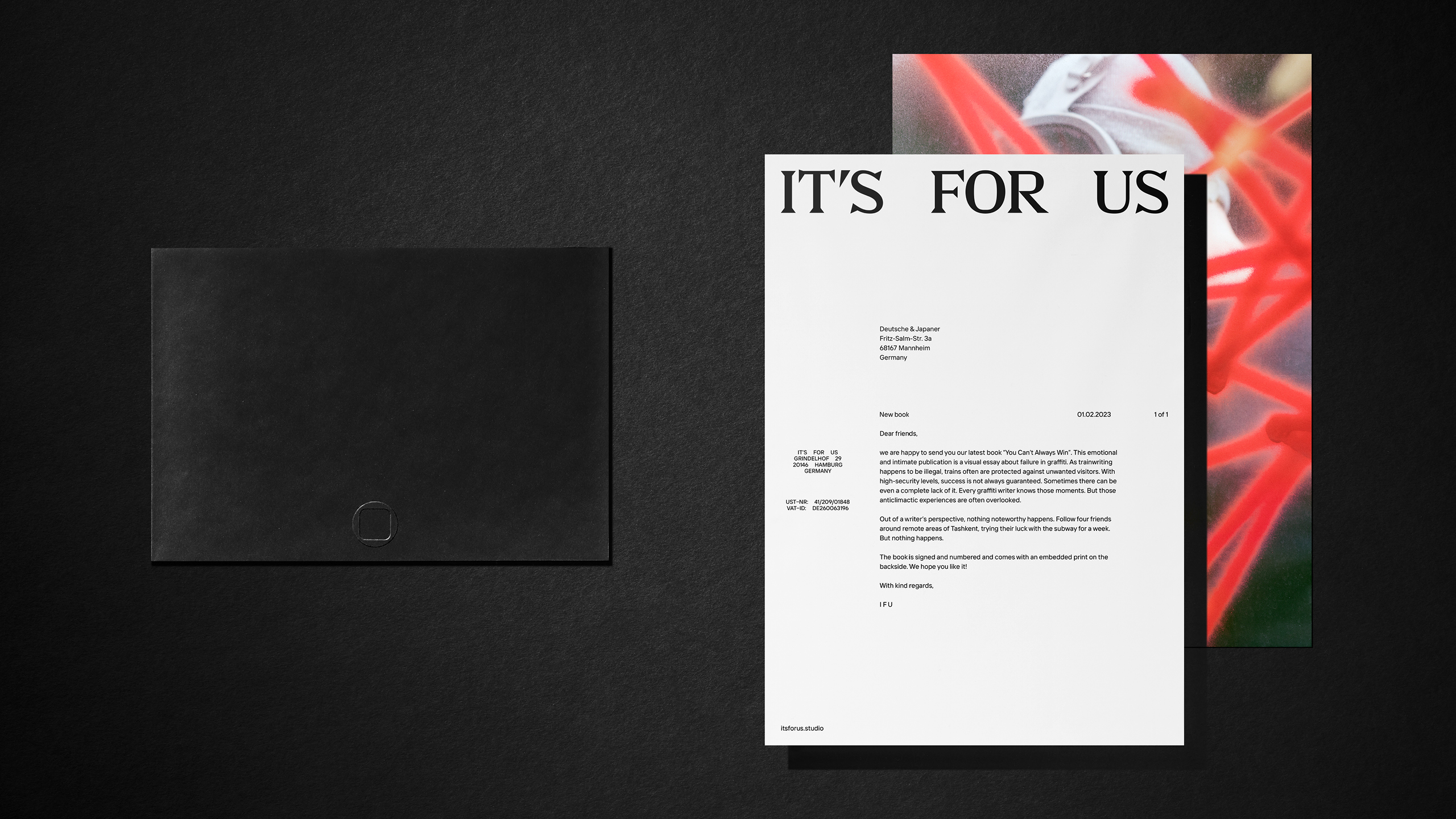 It’s for Us is a publisher dedicated to the culture of train writing. Being book lovers themselves, they set out to raise the bar for quality publishing in an emerging market, conserving an ephemeral culture. The Visual Identity includes an icon that references the square wrench used to unlock train doors.