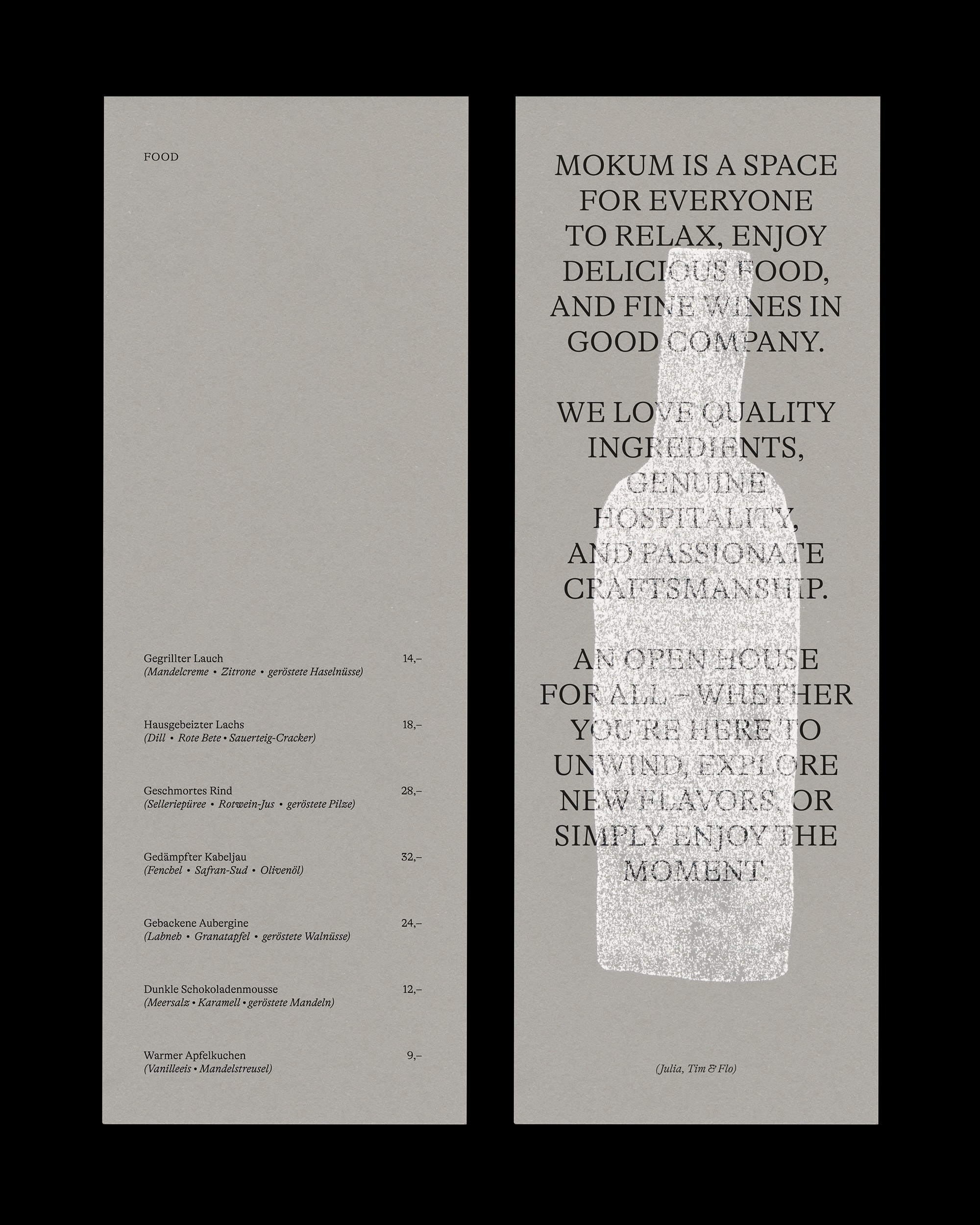Mokum is a small, cherished restaurant and daytime bar in Munich, located steps from the Theresienwiese — a neutral stage for culinary creativity, warmth, and precision. The visual identity reflects this character, centered around a set of hand-drawn illustrations that are stamped onto menus and collateral, each one slightly different, each a small original.