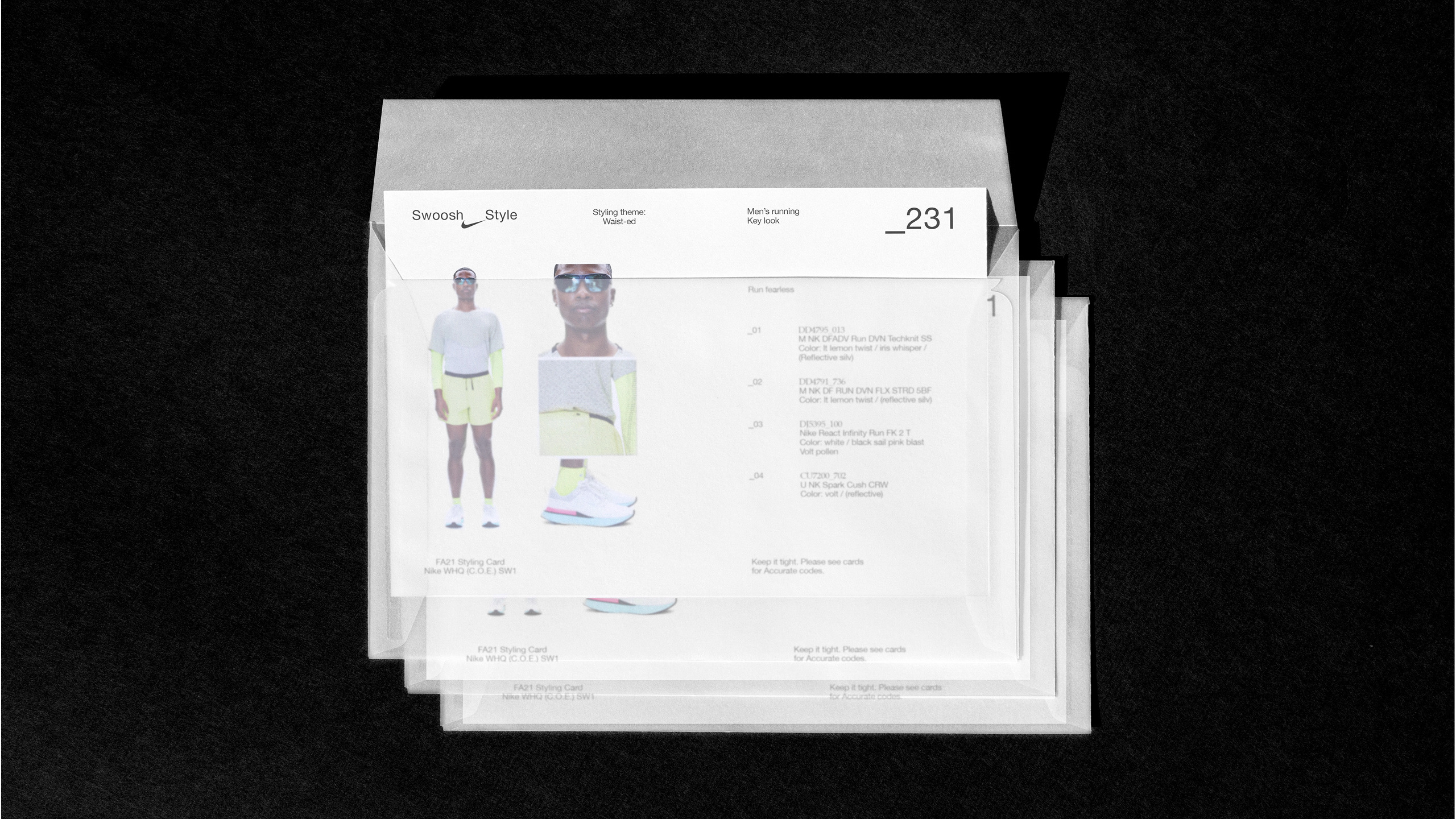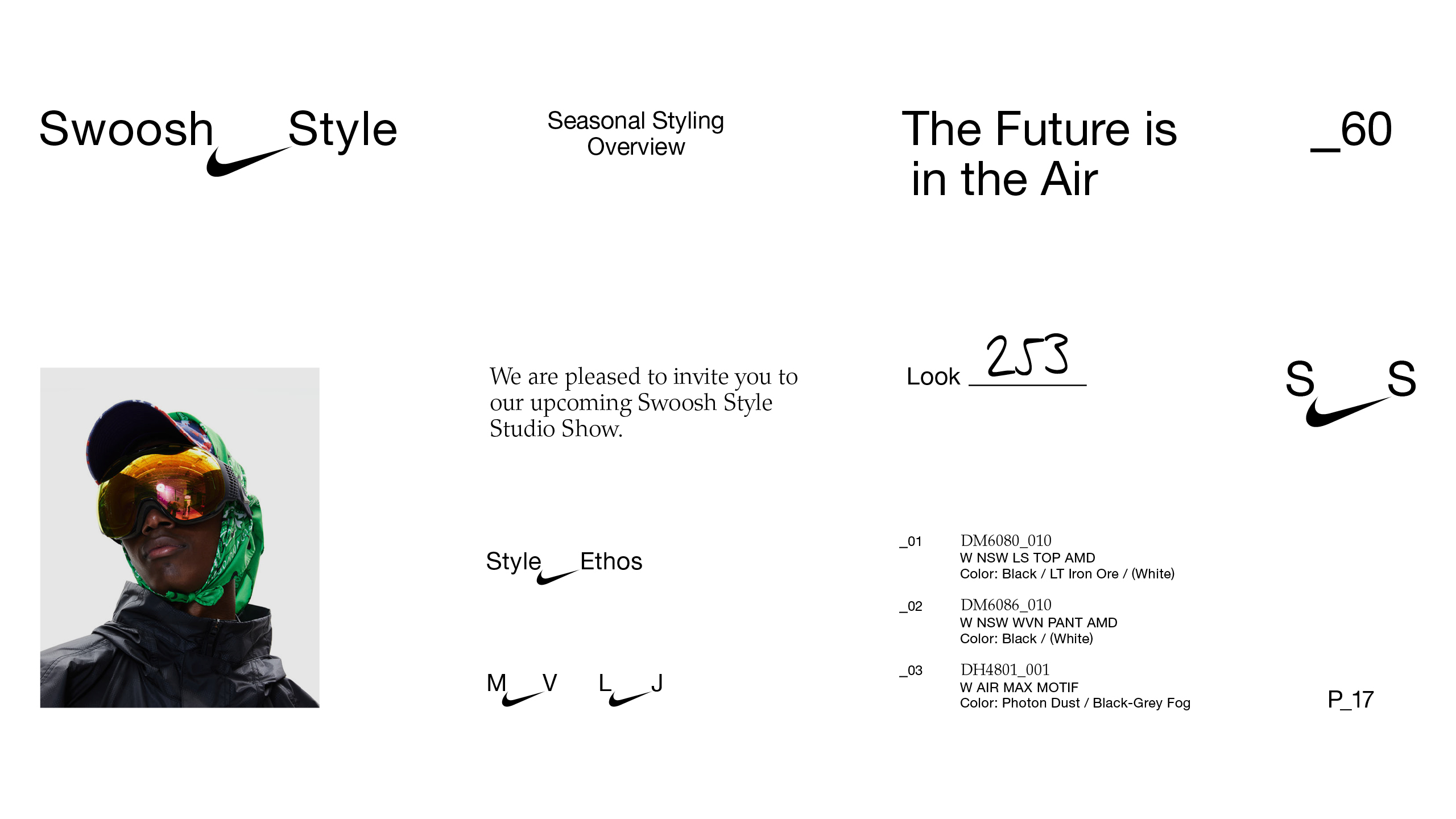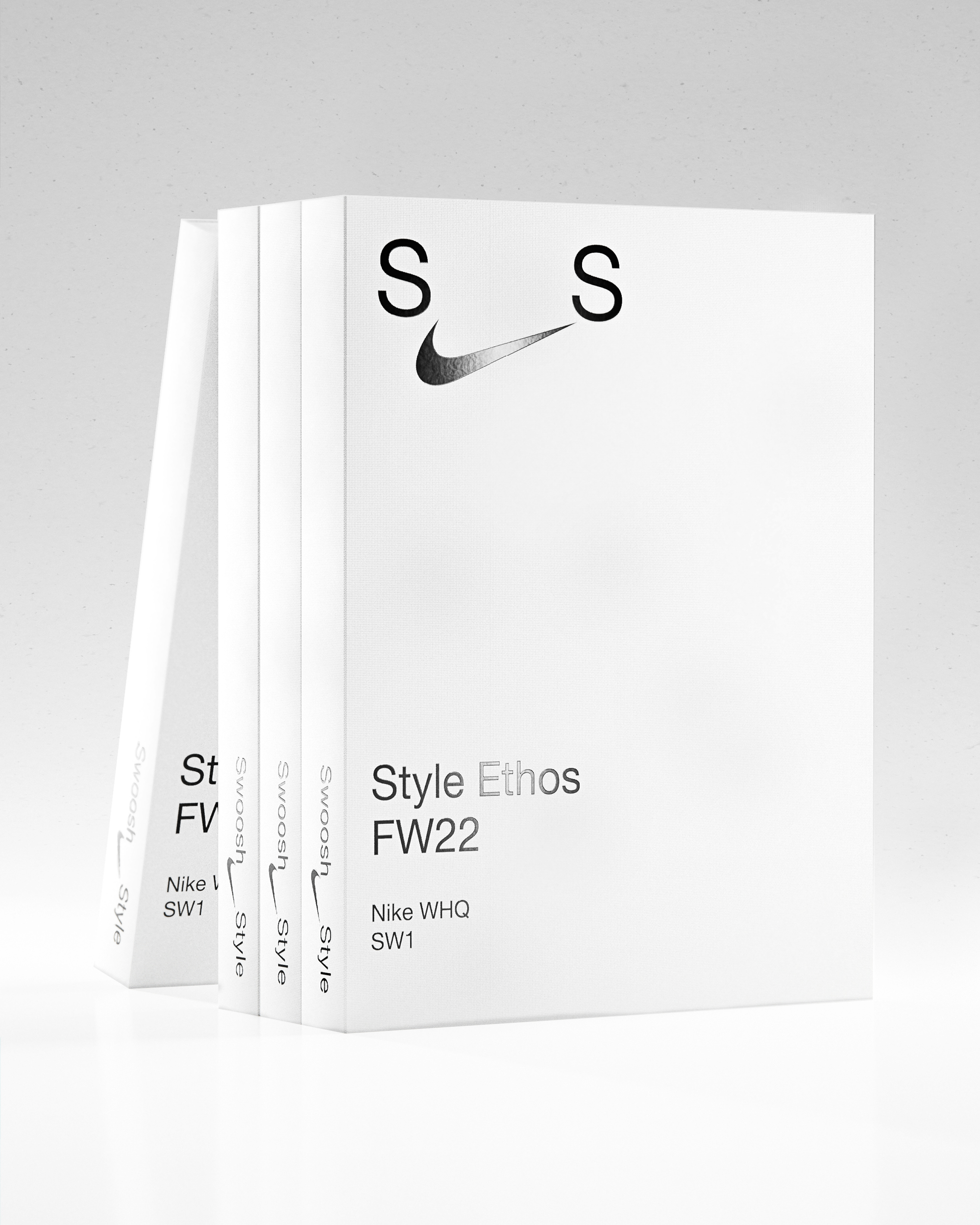 Visual Identity for Swoosh Style, Nike’s in-house styling department. The logo uses the Swoosh as a connector — visualizing how styling links individual pieces, references, and cultures into a whole. This idea carries through into text: an underscore serves as the connecting element across typography and small sizes. An understated, utilitarian identity that adapts across all scales without competing with the work it frames. The flexible system covers logo design, layout, guidelines, and interior and packaging concepts.