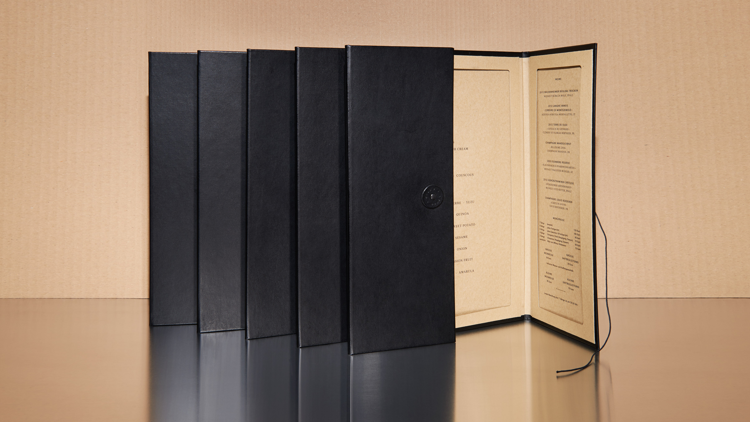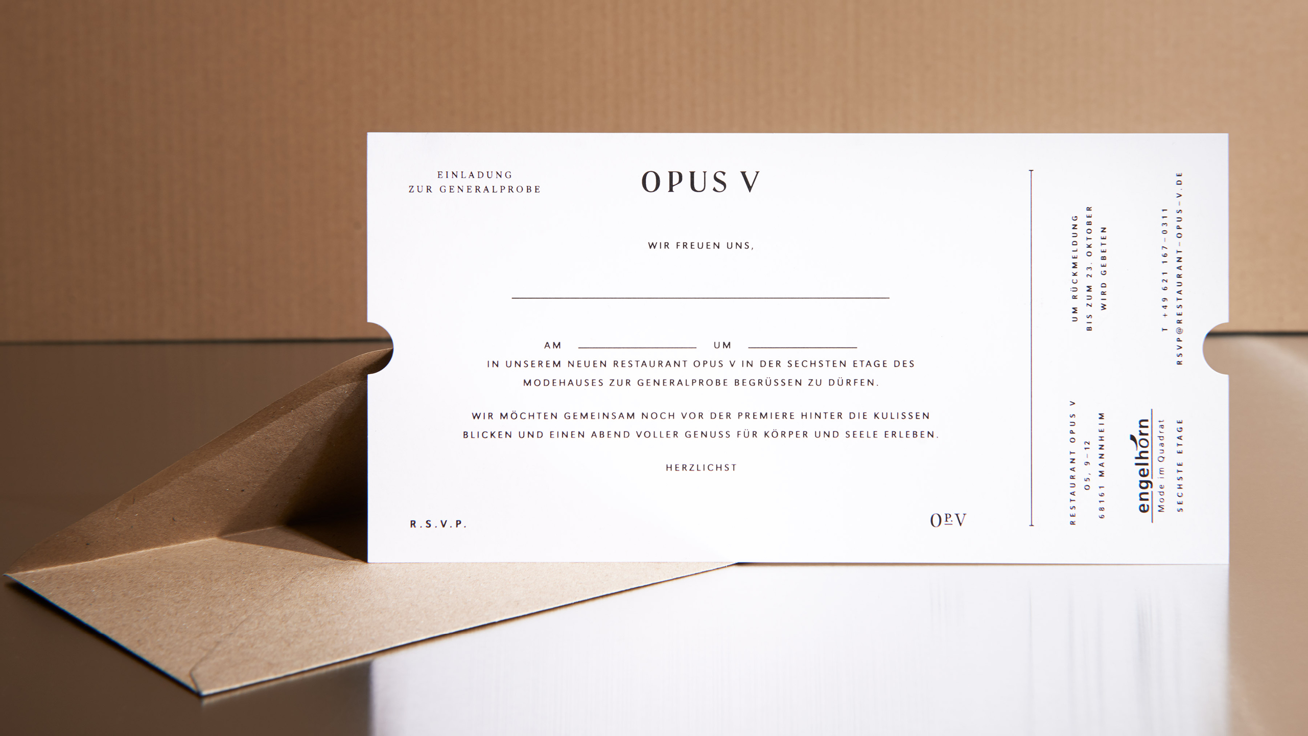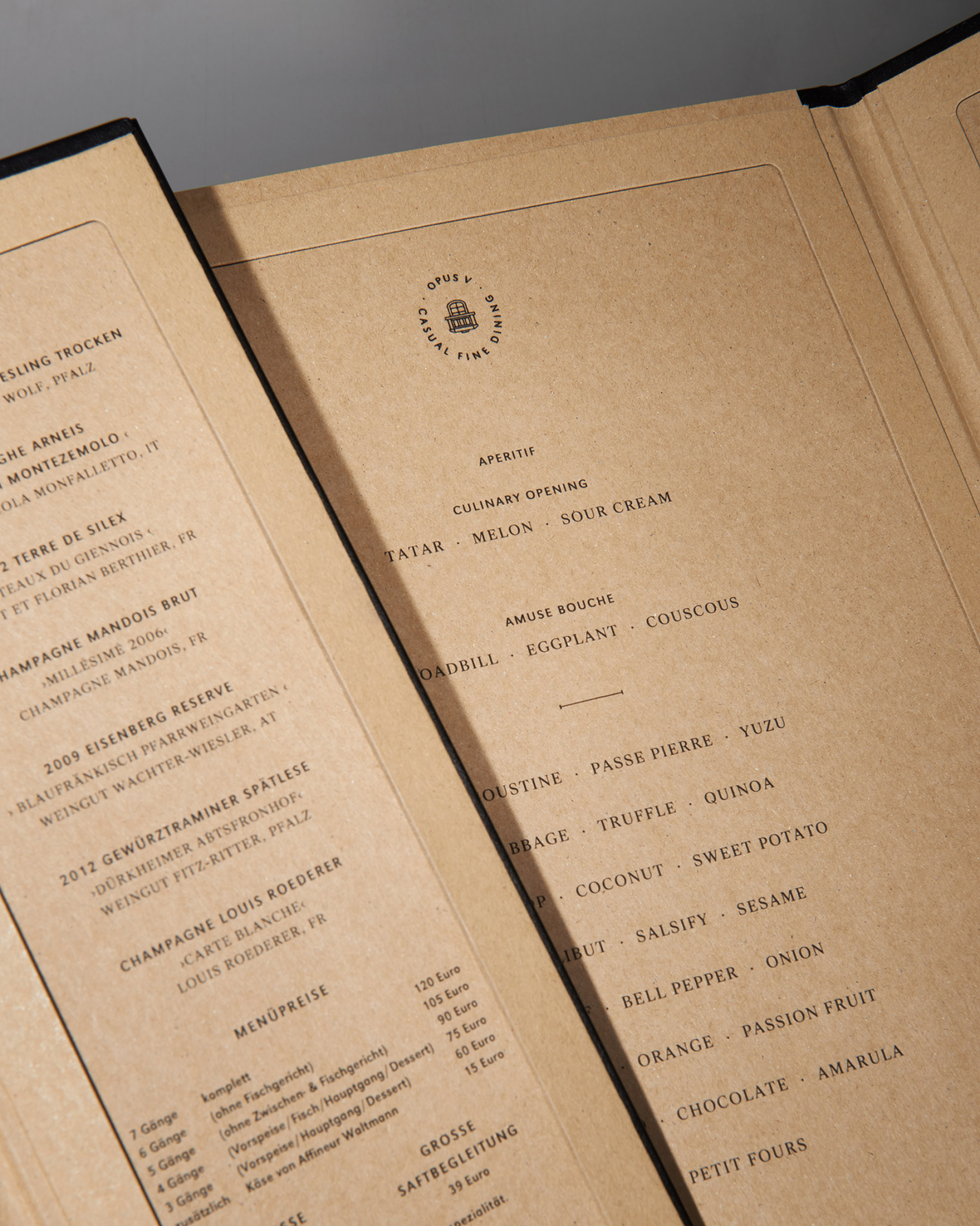 Visual Identity and naming for Opus V, a two Michelin-starred restaurant perched on the sixth floor above Mannheim, with sweeping views over the city. The entire identity takes its cue from the world of opera and theatre: a visit to Opus V is a performance. The name references a musical composition, the icon the theatre loge, and every detail is choreographed to place the guest at the center of the stage.