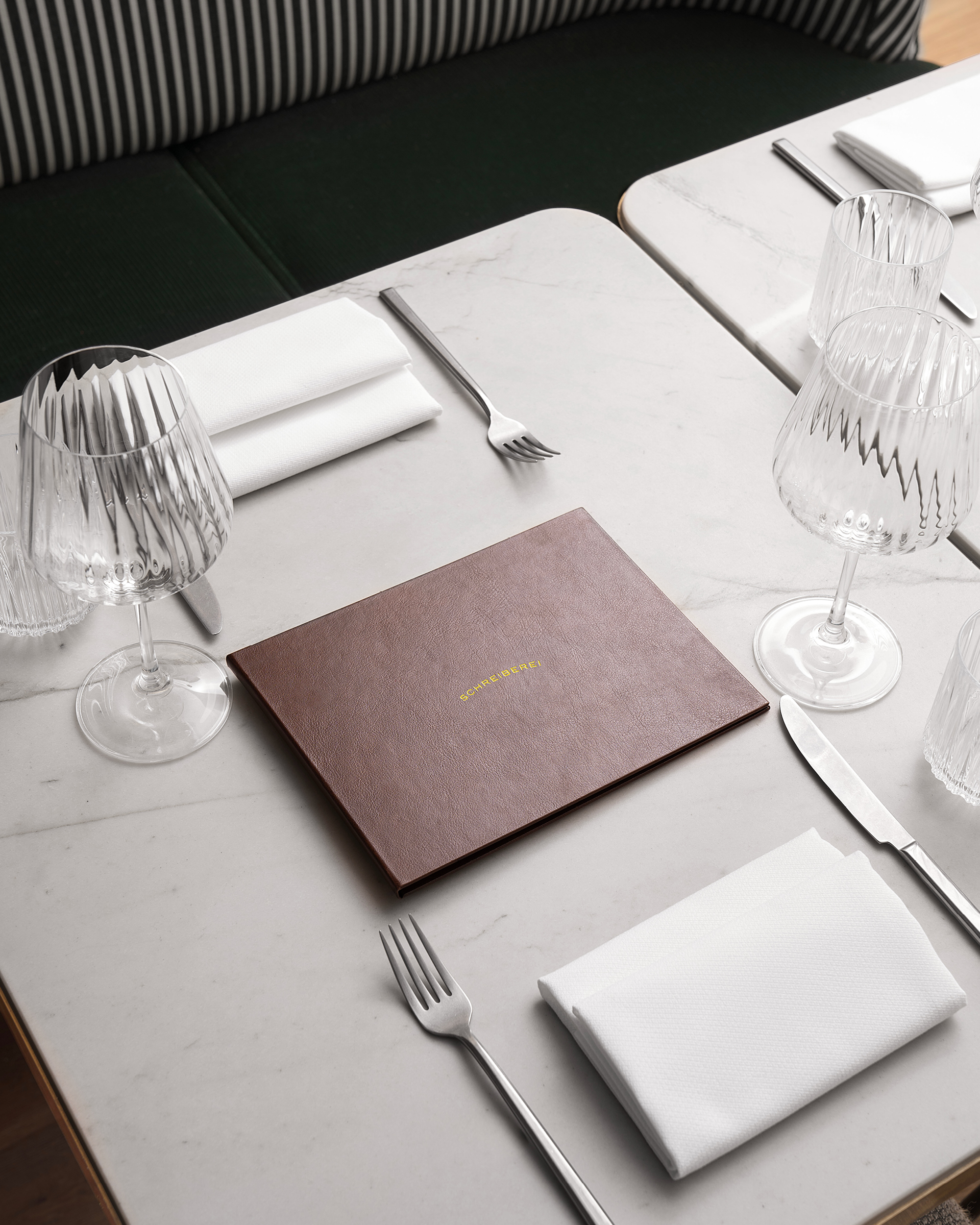 Located in the former Stadtschreiberei, one of Munich’s oldest townhouses (built in 1552), Schreiberei is a new brasserie concept serving delicacies on three different floors. The Visual Identity is a playful blend of classic brasserie codes, architectural and historical references and a contemporary, exuberant look.