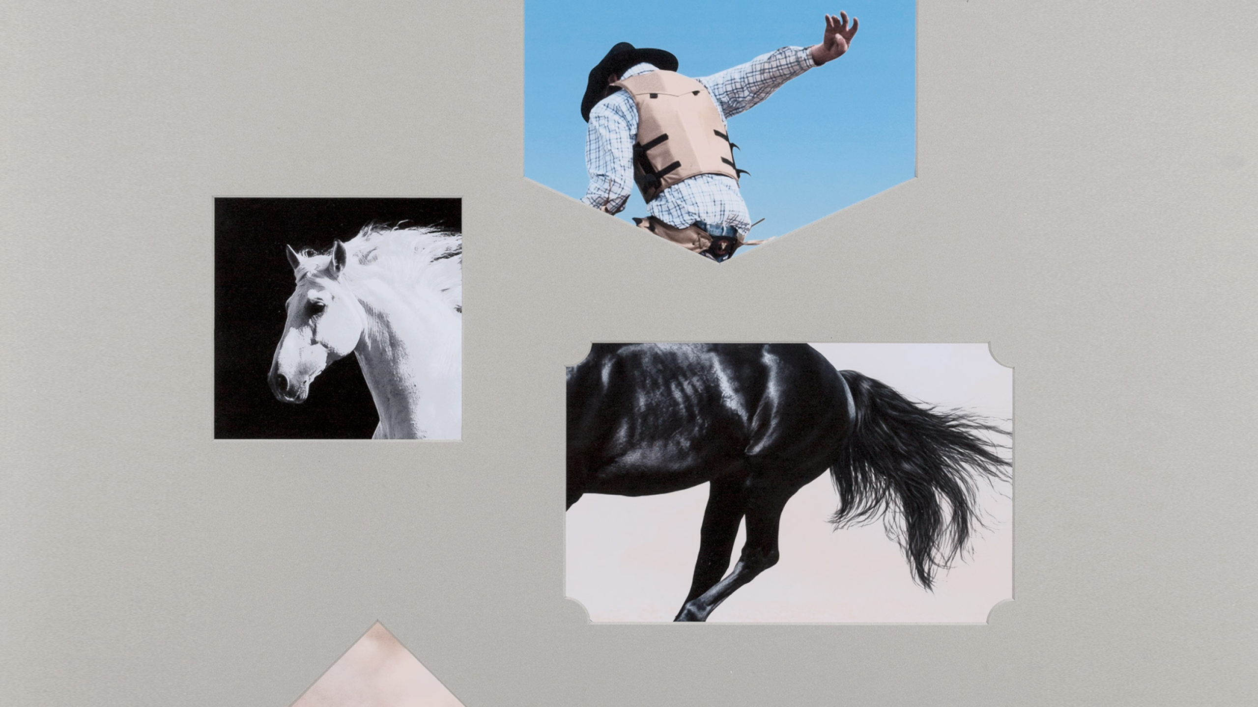 An exhibition contribution for Shutterstock’s “Analog Mensch Digital — Design an der Schnittstelle” at Direktorenhaus, Berlin, alongside studios including Hort, Fons Hickmann m23, and Elastique. The series of three posters builds around stock imagery: photographs placed behind passe-partout cutouts of varying shapes, creating the illusion of a composed scene from fragments.