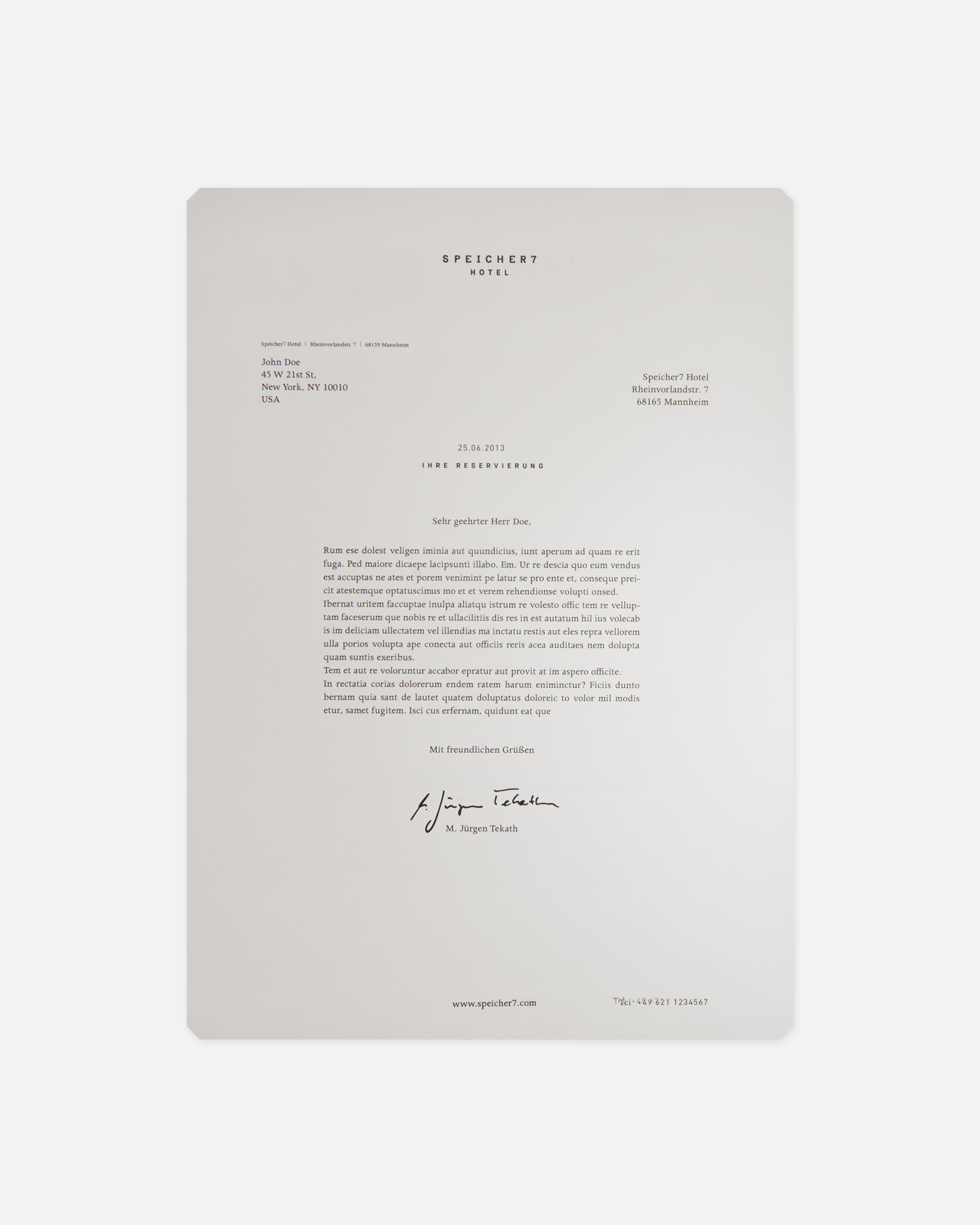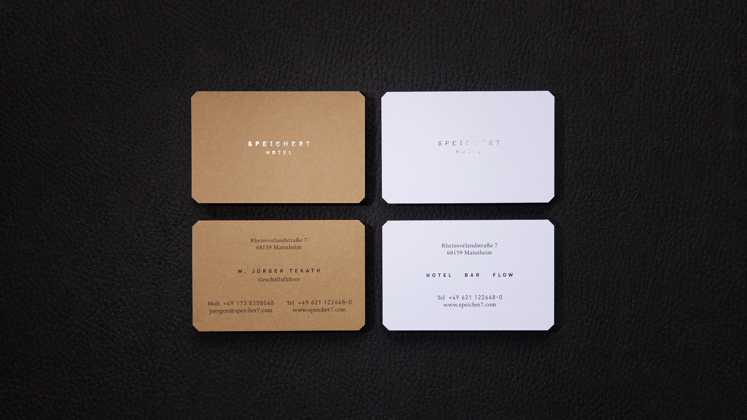 Visual Identity for Speicher7, a hotel housed in a listed warehouse building in the port area of Mannheim, dating back to the 1950s. The identity preserves the spirit and character of the building, drawing directly from its architecture. The chamfered edges of its structural columns become a recurring design element, running through a variety of media.