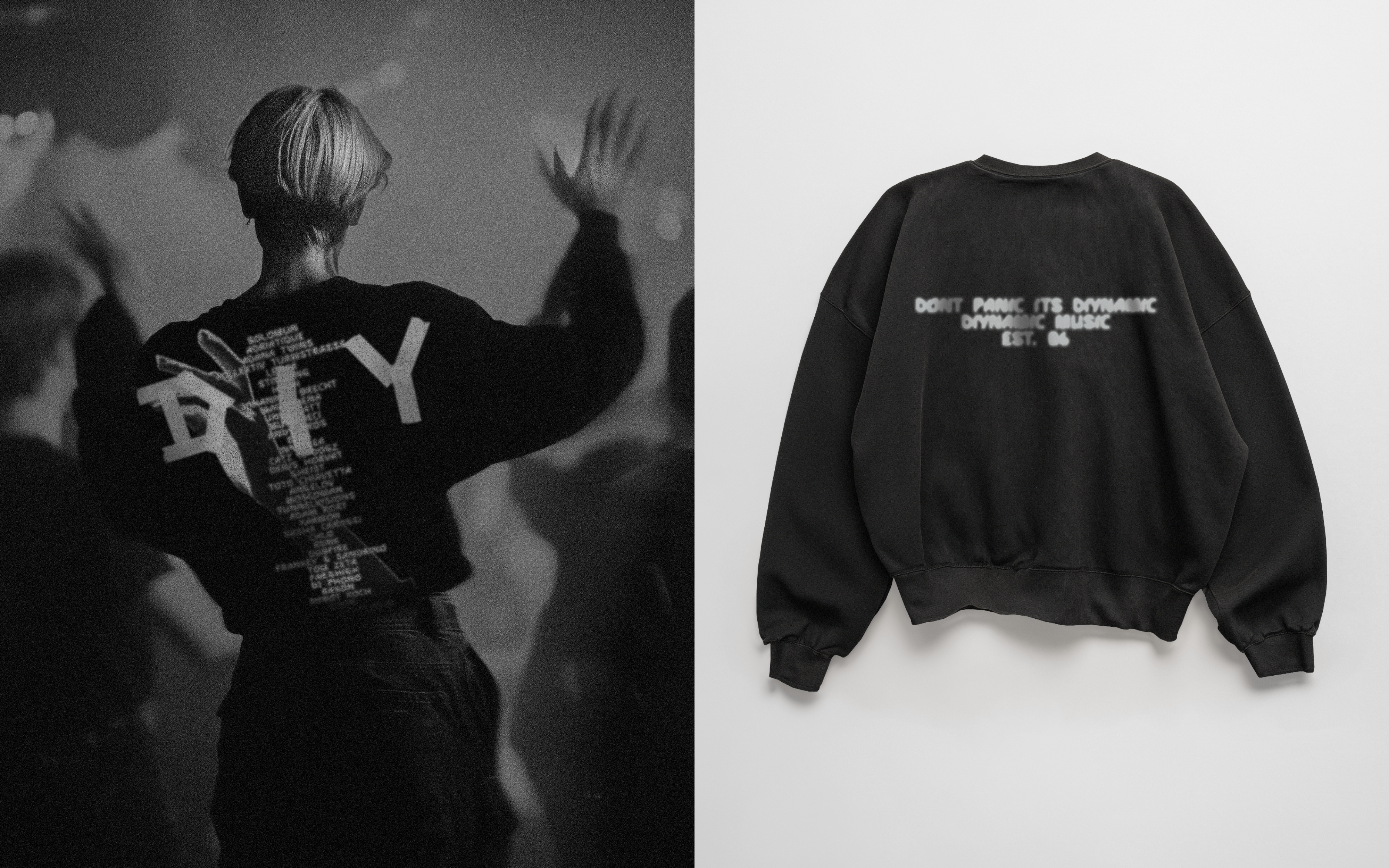 Merchandise collection for Diynamic, Solomun’s record label. The visual language translates the label’s DIY ethos directly into the design: type and graphics treated as if taped and cut by hand, raw and immediate. A strobe-light effect runs through the image treatment — capturing the fleeting, fragmented perception of a moment on the dancefloor. The collection includes t-shirts, hoodies, and crewnecks.