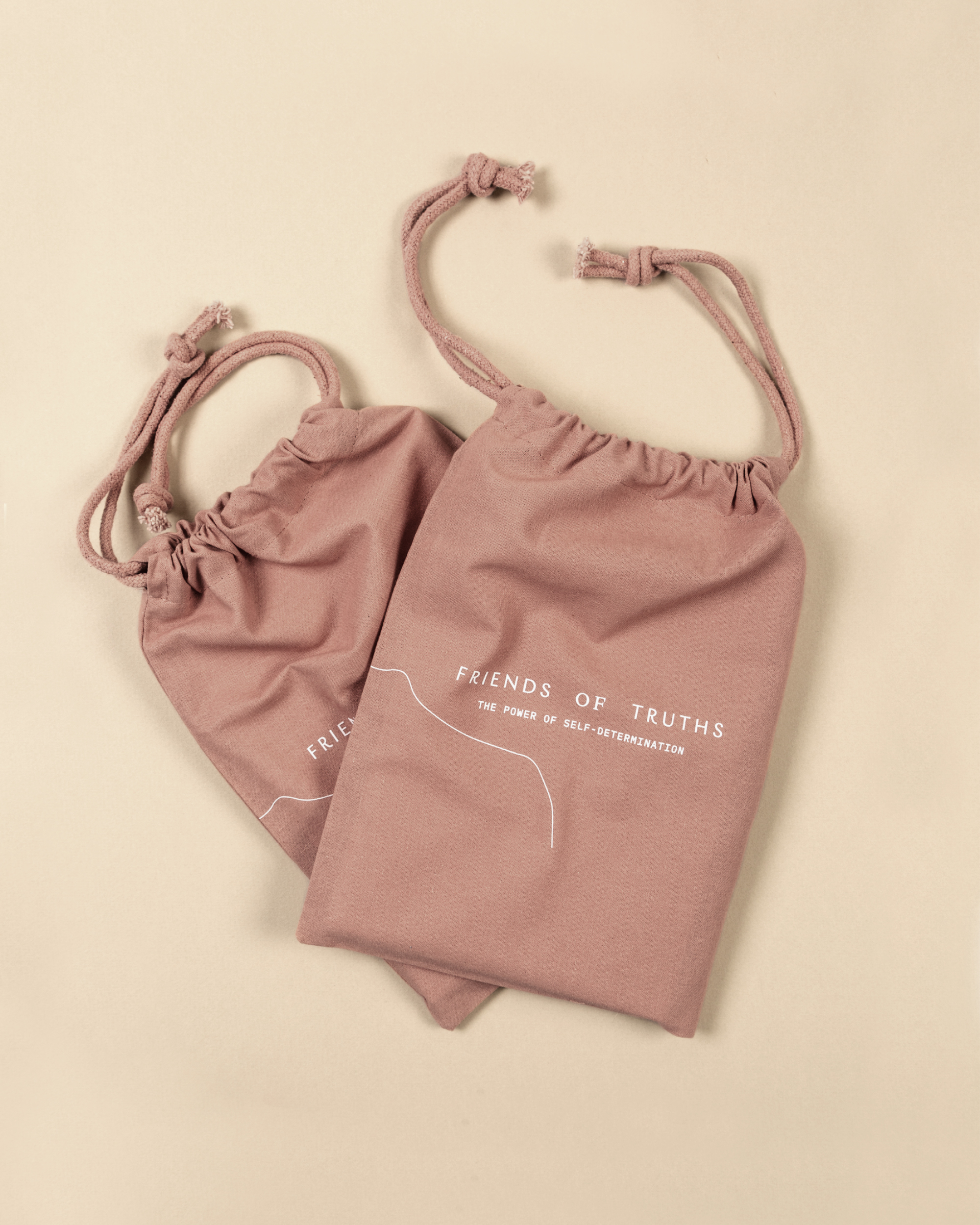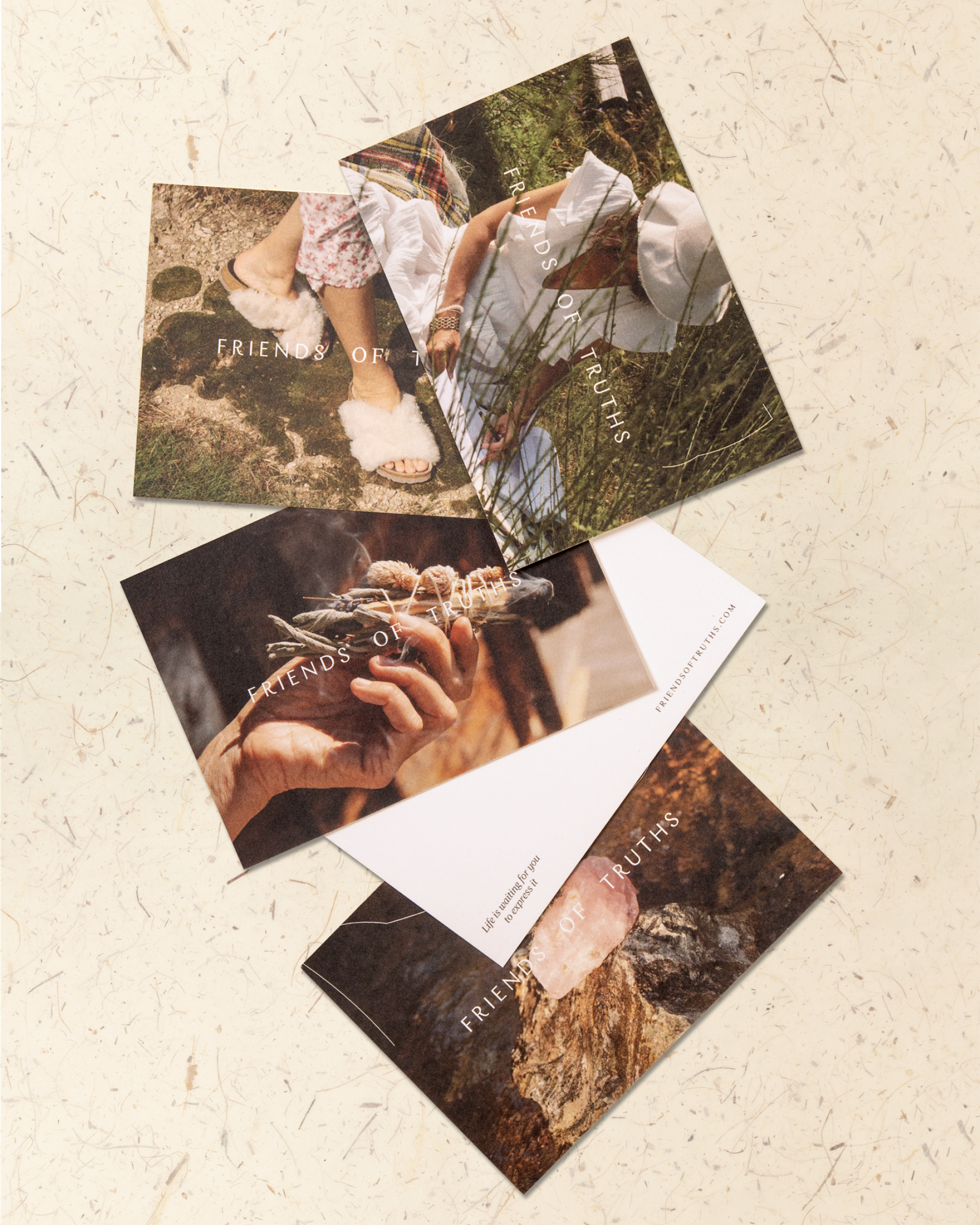 Friends of Truths is a spiritual lifestyle brand dedicated to conscious living. The identity revolves around connection: people to people, body to mind, human to nature. A hand-drawn line runs through the layouts as a recurring element, tracing these invisible threads. The brand’s initials are held within a band that evokes infinity, DNA, and the delicate ties that bind.