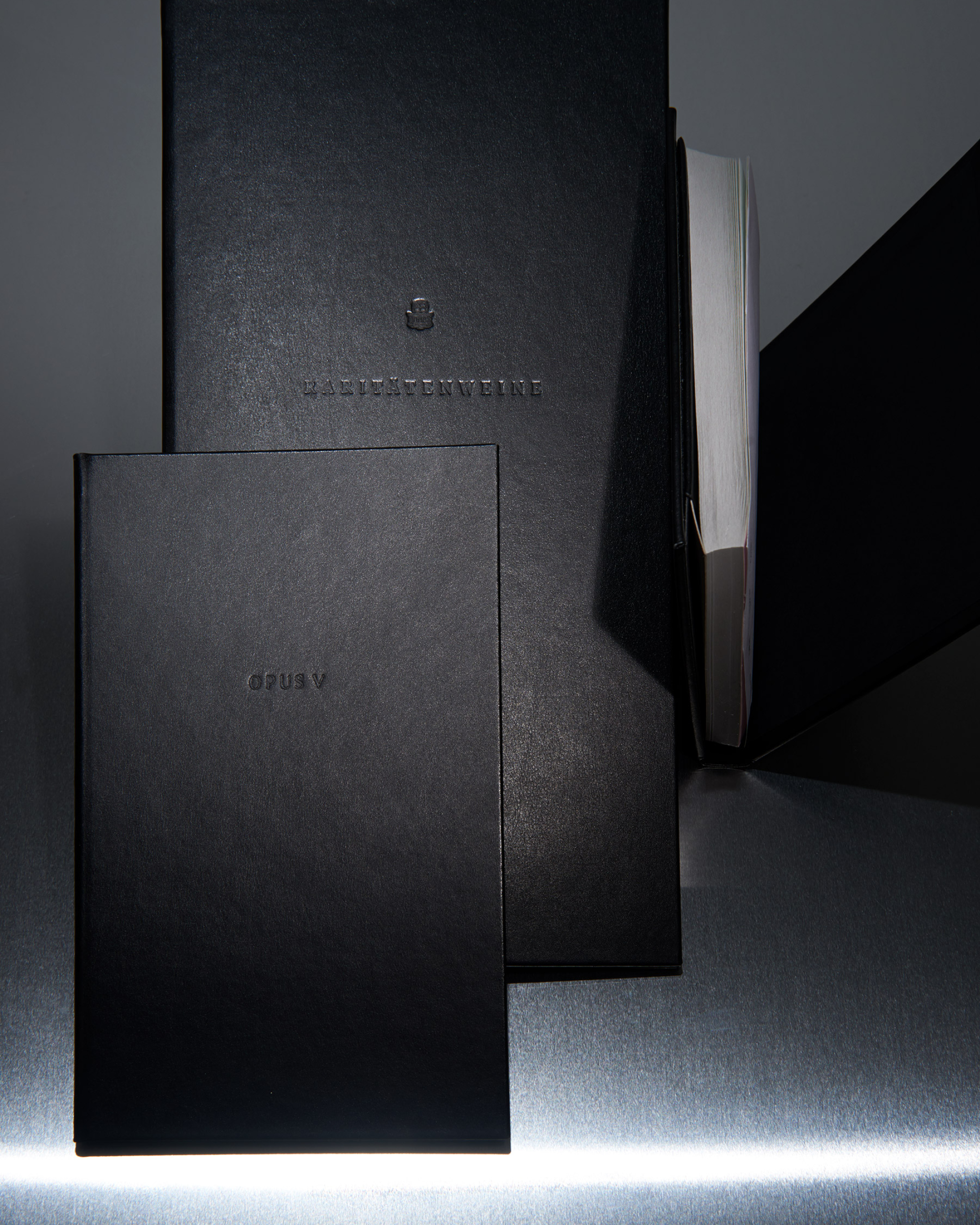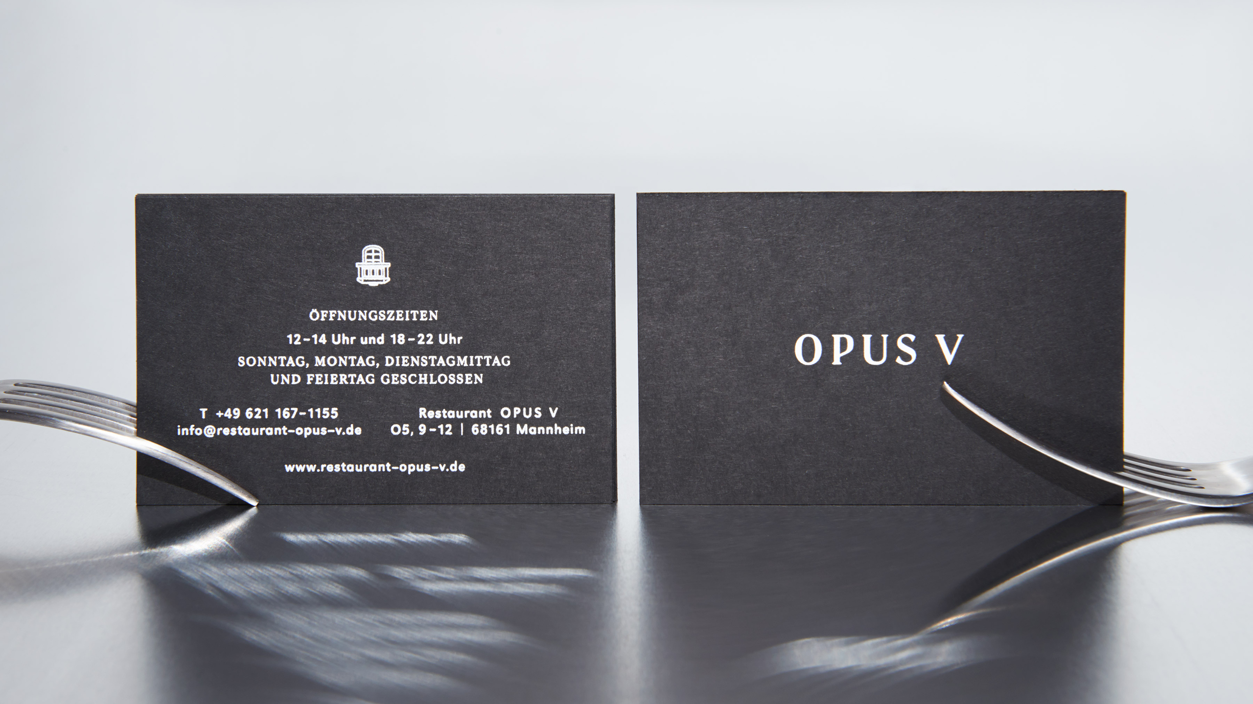 Visual Identity and naming for Opus V, a two Michelin-starred restaurant perched on the sixth floor above Mannheim, with sweeping views over the city. The entire identity takes its cue from the world of opera and theatre: a visit to Opus V is a performance. The name references a musical composition, the icon the theatre loge, and every detail is choreographed to place the guest at the center of the stage.