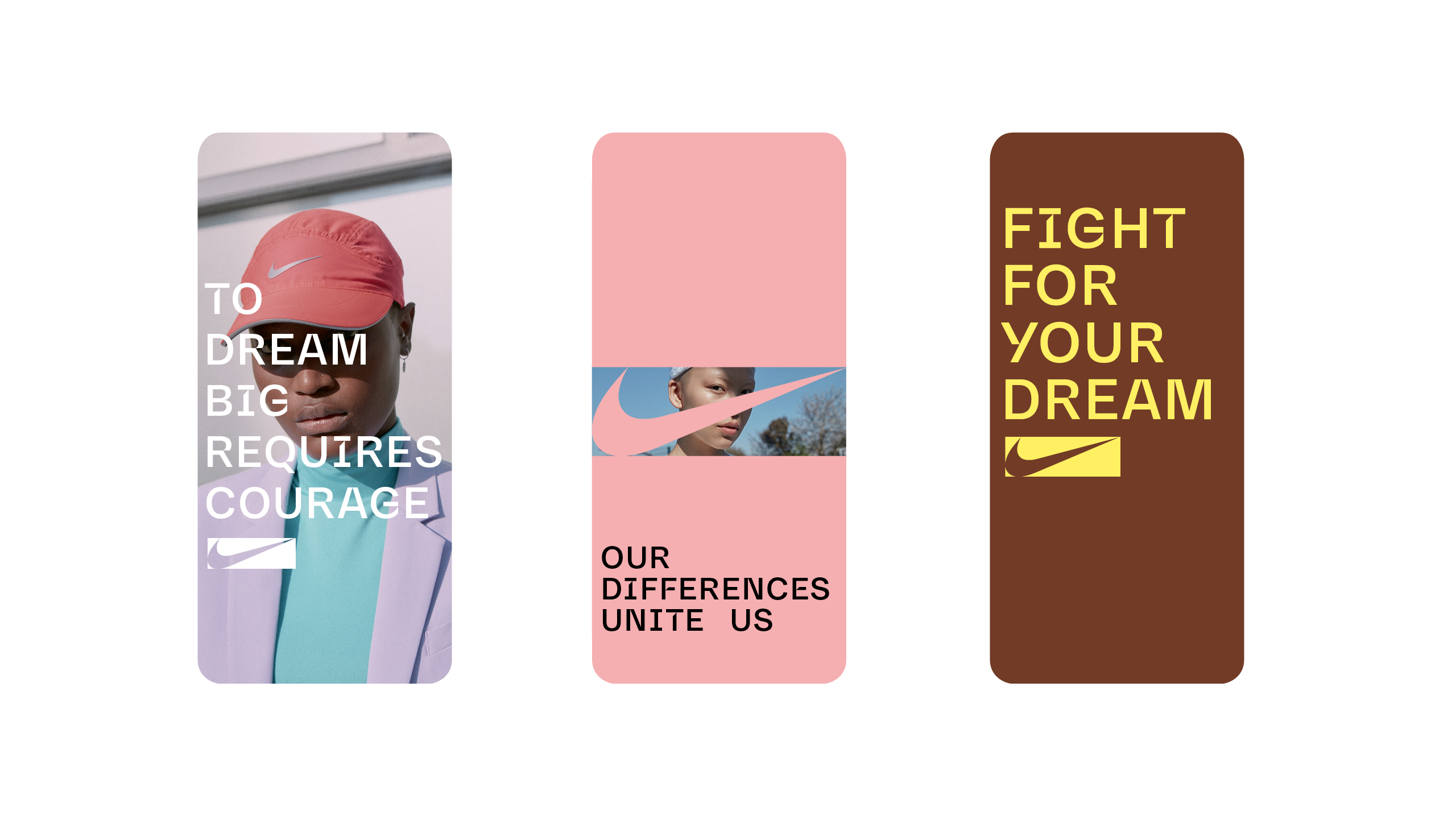 The redefinition of Nike Women’s view of femininity and equality is built around a single idea: to be moved, inspired, or electrified — you have to be touched first. This principle translates directly into the visual language: a Swoosh that touches the edges of its frame, and a bespoke typeface where letterforms make contact, creating tension and sensuality through touch. The identity extends across typeface design, color, layout guidelines, retail concepts, and product development.